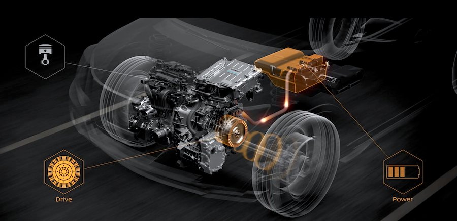 ภายใต้การขับเคลื่อนของเทคโนโลยีอี-พาวเวอร์นั้น ล้อจะถูกขับเคลื่อนด้วยมอเตอร์ไฟฟ้าเท่านั้น โดยจะใช้พลังงานไฟฟ้าที่ได้จากเครื่องยนต์สันดาปภายใน โดยที่เครื่องยนต์จะไม่ได้ทำงานเฉพาะการชาร์จสู่แบตเตอรี่เท่านั้น แต่ยังให้กำเนิดกระแสไฟฟ้าจ่ายสู่ อินเวอร์เตอร์ (Inverter) และไปสู่มอเตอร์ไฟฟ้า เมื่อต้องการเร่งความเร็วเป็นพิเศษ หรือขึ้นที่สูงชัน มอเตอร์ไฟฟ้าจะได้รับพลังงานจากทั้งแบตเตอรี่และเครื่องยนต์เพื่อช่วยเพิ่มประสิทธิภาพเครื่องยนต์ ซึ่งเทคโนโลยี อี-พาวเวอร์จะให้ประสิทธิภาพการใช้เชื้อเพลิงที่เหนือกว่าและปล่อยไอเสียน้อยกว่า เมื่อเปรียบเทียบกับเครื่องยนต์สันดาปภายในทั่วไป