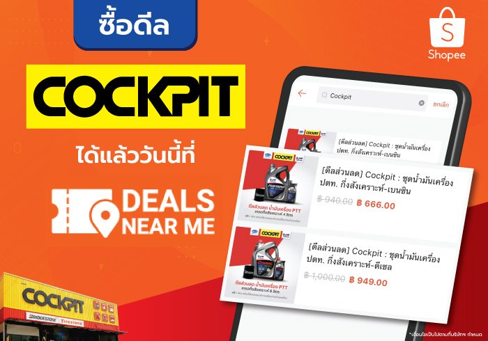 Deals Near Me แอพพลิเคชั่นช้อปปิ้งออนไลน์ Shopee คือ บริการใหม่ที่สามารถค้นหาดีลส่วนลดร้านค้า ร้านอาหาร ศูนย์บริการ รวมถึงสินค้า ได้ในส่วนลดสุดพิเศษ ภายในบริเวณใกล้เคียง เป็นกลยุทธ์เพื่อที่จะเพิ่มจำนวนลูกค้าออนไลน์จากแอพพลิเคชั่น ให้มาใช้บริการสู่ร้านค้าและศูนย์บริการ โดย ค็อกพิท (Cockpit) ศูนย์บริการรถยนต์ครบวงจรที่มีสาขามากที่สุดในประเทศไทย ขอร่วมเป็นส่วนหนึ่งที่ยังคงเดินหน้าเพิ่มช่องทางอำนวยความสะดวก รองรับการให้บริการให้แก่ลูกค้า รวมถึงการจัดดีลส่วนลดราคาพิเศษ น้ำมันเครื่องปตท. เกรดกึ่งสังเคราะห์ เบนซิน 4 ลิตร ราคาพิเศษ 666 บาท และ น้ำมันเครื่องปตท. เกรดกึ่งสังเคราะห์ ดีเซล 6 ลิตร ราคาพิเศษ 949 บาท โดยสามารถนำส่วนลดนี้เข้ารับบริการได้ที่ ค็อกพิท 98 สาขาที่ร่วมรายการ