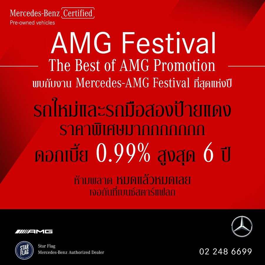 ชยุส ยังพิชิต กรรมการผู้จัดการ บริษัท สตาร์แฟลก จำกัด เปิดเผยว่า ช่วง 10 เดือนที่ผ่านมา บริษัทฯ ประสบความสำเร็จอยางมาก โดยลูกค้าให้การตอบรับรถยนต์เมอร์เซเดส-เบนซ์ เป็นอย่างดี และในช่วงโค้งสุดท้ายของปีนี้ เบนซ์สตาร์แฟลก ยังเดินเกมรุกพบกับครั้งแรกกับงาน Mercedes-AMG Festival ยกทัพ Mercedes-AMG จัดเต็มทุกรุ่น พร้อมสิทธิพิเศษ อาทิ เช่น Mercedes-AMG GT53 4MATIC+ 4-Door Coupé , Mercedes -AMG C43 4MATIC Coupe, Mercedes-AMG CLA 35 4MATIC, Mercedes-AMG E53 4MATIC, Mercedes-AMG GLC43 4MATIC ไฮไลท์ พิเศษ ที่นี่ที่เดียว Mercedes-AMG GT53 4MATIC+ 4-Door Coupé รถสปอร์ตในฝันที่นักสะสมต้องมีไว้ครอบครอง หรูหราเหนือใคร กับข้อเสนอที่คุณจะปฏิเสธไม่ได้ ผ่อนเริ่มต้นเพียง 99,999 บาท มาพร้อมกองทัพรถใหม่ครบทุกรุ่น และ รถผู้บริหาร ไมล์น้อย ป้ายแดง สภาพใหม่เอี่ยม ให้คุณผ่อน ดอกเบี้ย 0.99% นานสูงสุด 6 ปี ที่เหนือกว่าใครกับราคาที่พิเศษสุดๆ ย้ำ!!!! ที่เดียว ที่เบนซ์สตาร์แฟลกเท่านั้น