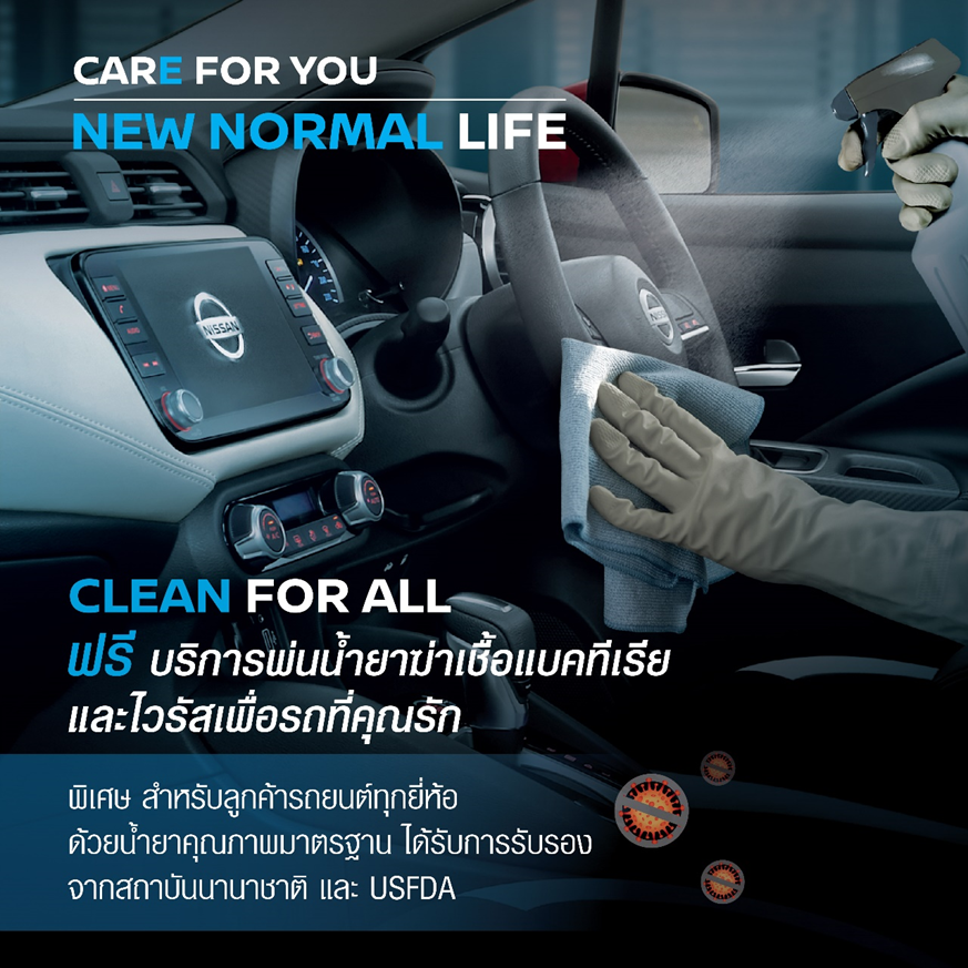 นิสสัน มอเตอร์ ประเทศไทย มอบโปรแกรมการบริการ ‘CARE FOR YOU – New Normal Life’ แทนความห่วงใยจากนิสสันอีกครั้ง สนับสนุนมาตรการเพื่อดูแล และยกระดับความปลอดภัยให้แก่ลูกค้า ในช่วงที่สถานการณ์การระบาดของโรคโควิด-19 โปรแกรมการบริการ ‘CARE FOR YOU ให้การบริการตรวจเช็คระยะนอกสถานที่และบริการรับรถที่บ้านลูกค้าความสะอาดและพ่นน้ำยาฆ่าเชื้อภายในรถของคุณ โดยไม่เสียค่าใช้จ่าย ณ โชว์รูมและศูนย์บริการนิสสัน ทั่วประเทศ สำหรับลูกค้าที่สนใจรถยนต์นิสสันในช่วงนี้ นิสสันให้บริการทดลองขับถึงบ้านโดยลงทะเบียนเพื่อทดลองขับได้ง่าย ๆ ผ่าน เว็บไซต์ของนิสสัน หรือ Facebook