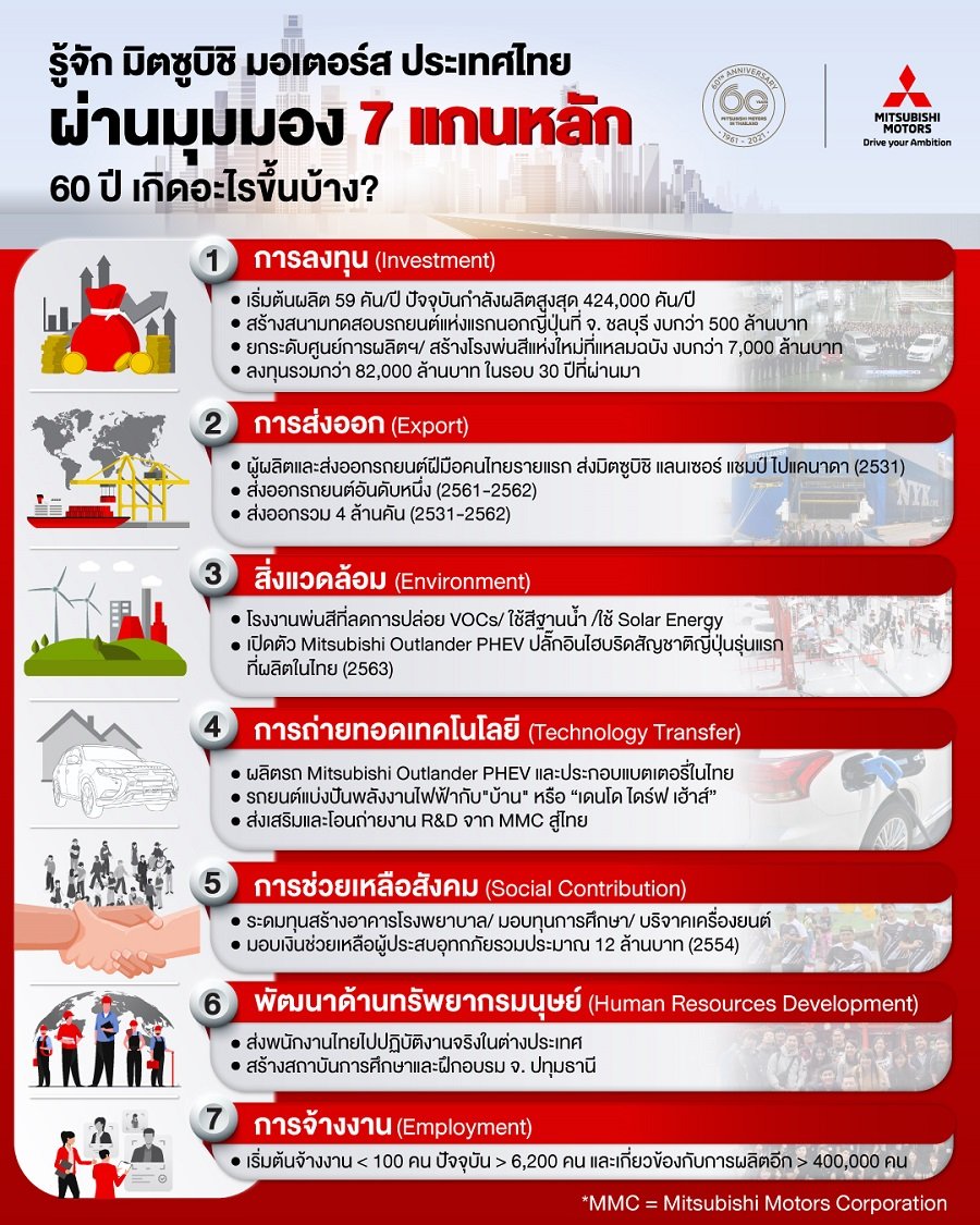มิตซูบิชิ มอเตอร์ส (ประเทศไทย) จำกัด ก้าวสู่ปีที่ 60 ของการดำเนินธุรกิจในประเทศไทย จากจุดเริ่มต้นในปี พ.ศ. 2504 ภายใต้การบริหารงานของบริษัท สิทธิผล มอเตอร์ จำกัด สู่การเข้าบริหารงานแบบเต็มรูปแบบ ภายใต้ชื่อใหม่ บริษัท มิตซูบิชิ มอเตอร์ส (ประเทศไทย) จำกัด ในปี พ.ศ. 2546 ร่วมเป็นส่วนหนึ่งของการพัฒนาและสร้างความสำเร็จในด้านต่างๆ ที่สำคัญอย่างต่อเนื่องจนปัจจุบัน เป็นที่มาของความภาคภูมิใจที่ได้เป็นส่วนหนึ่งในช่วงเวลาดีๆ ของคนไทย ผ่านการสร้างสรรค์สังคมไทยให้เติบโตทั้งด้านเศรษฐกิจ ผ่านการลงทุน การส่งออก และการจ้างงานในประเทศ ตลอดจนการพัฒนาศักยภาพของคนไทย รวมถึงการถ่ายทอดเทคโนโลยียานยนต์ระดับโลก ภายใต้นโยบายของการเป็นส่วนสำคัญในการสร้างสังคมและสิ่งแวดล้อมที่ดี เพื่อเป้าหมายของการเติบโตของสังคมที่ยั่งยืน พร้อมขอบคุณคนไทยด้วยแคมเปญพิเศษ มอบเป็นของขวัญ สุดเซอร์ไพรส์ในโอกาสสำคัญกับแคมเปญ “มิตซูบิชิ มอเตอร์ส ในประเทศไทย ฉลอง 60 ปี แจก 60 ล้าน” แจกทองคำแท่ง 60 บาท จำนวน 6 รางวัล และรางวัลอื่นๆ รวมกว่า 1,200 รางวัล รวมมูลค่ากว่า 60 ล้านบาท สำหรับผู้ที่ซื้อรถยนต์มิตซูบิชิ รุ่นใดก็ได้ เริ่มแล้ววันนี้ – 31 ธันวาคม 2564 ยิ่งซื้อเร็ว ยิ่งมีสิทธิ์มาก อีกทั้งเดินหน้าดำเนินกิจกรรมเพื่อสังคม ด้วยการเปิดตัวมูลนิธิมิตซูบิชิ มอเตอร์ส ประเทศไทย เพื่อแสดงพันธสัญญาของการดำเนินงานด้านกิจกรรมเพื่อสังคมอย่างเป็นรูปธรรมในระยะยาว กับโครงการแรก “ปลูกป่า 60 ไร่” ตั้งเป้าหมายอนาคตชัดร่วมสร้างสังคมไทยที่ยั่งยืน