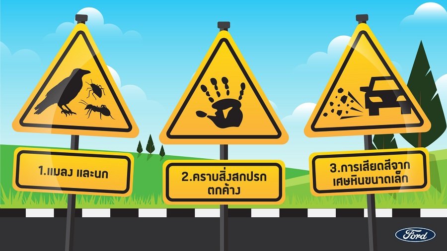 ระวังภัยใกล้ตัวที่ทำร้ายสีรถ ถึงแม้เราจะจอดรถในที่จอดที่มีหลังคา ก็อาจหลีกเลี่ยงปัจจัยภายนอกที่มาพร้อมกับสภาพแวดล้อมกลางแจ้งไม่ได้ ไม่ว่าจะเป็นแมลง สัตว์ ฝุ่นละออง หรืออะไรต่างๆ ที่บินหรือลอยเข้ามาโดนรถ เพราะฉะนั้นเจ้าของรถจึงต้องพึงระวังสิ่งเหล่านี้ และรีบล้างทำความสะอาดรถไม่ให้รถมีสิ่งตกค้างติดทนหรือเป็นรอย แมลง และนก สามารถสร้างรอยที่ทำให้ทำความสะอาดยากได้อย่างไม่น่าเชื่อ โดยแมลงที่บินมาชนรถนั้นมีฤทธิ์เป็นกรด คราบจากแมลงอาจกัดสีรถให้เสียหายได้ ส่วนของเสียจากนก นอกจากมีฤทธิ์เป็นกรดแล้ว ก็ยังอาจมีเมล็ดพืช และผลเบอร์รี่ปะปนอยู่ หากไม่รีบล้าง คราบก็จะฝังแน่นบนผิวสีรถ ทำให้รถไม่สวยงามแวววาว สิ่งสกปรกต่างๆ ก็ยังเกิดได้จากการเติมน้ำมันล้นถังจนซึมออกมาเปื้อนตัวถัง เมื่อฝุ่นละอองและควันในอากาศลอยมาก็จะจับกับสีตัวรถ จึงควรหมั่นปัดฝุ่น หรือทำความสะอาดด้วยผ้าไมโครไฟเบอร์ และที่สำคัญคือไม่ควรลากนิ้วหรือมือบนรถที่มีฝุ่นเกาะ เพราะการกระทำดังกล่าวจะทำให้ฝุ่นผง และสิ่งสกปรกต่างๆ ที่อยู่บนรถอยู่แล้วทิ้งร่อยรอยทำให้กำจัดยากขึ้น การจอดรถทิ้งไว้เฉยๆ หรือขับไปซื้อของใกล้บ้าน ไม่ได้แปลว่ารถจะไม่ได้รับการขีดข่วนใดๆ เลย เพราะกรวด หิน ดิน ทราย สามารถกระเด็นมาโดนและทิ้งรอยขีดข่วนได้จนสามารถทำให้สีเคลือบเป็นรอย นอกจากการปัดฝุ่นแล้วยังควรกำจัดรอยขีดข่วนด้วยการเคลือบสีด้วย