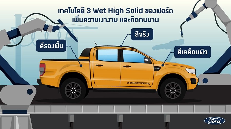 เทคโนโลยีการพ่นสีรถขั้นสูง แน่นอนว่า รอยขีดข่วน สีแตกกระเทาะ และสนิม เป็นสิ่งที่ทำให้คนรักรถไม่สบายใจ สำหรับฟอร์ด นอกจากเราจะให้ความสำคัญกับมาตรฐานเรื่องสีรถเป็นอย่างมากแล้ว เรายังให้ความสำคัญในการทำให้สีรถติดทนนานเพื่อให้รถมีสีสันสวยงามตลอดอายุการใช้งาน ด้วยเทคโนโลยีการพ่นสีพิเศษแบบ 3 Wet (3-Wet Paint Technology) หรือการพ่นสีทับกัน 3 ชั้น และอบสีเพียงครั้งเดียว โดยสีที่ใช้เป็นสารเคมีที่มีความเข้มข้นสูง จึงทำให้มีพื้นผิวหนาและแข็งแรงมากยิ่งขึ้น ทนทานต่อการขีดข่วน การแตกกระเทาะและป้องกันการกัดกร่อนของสี ทำให้สีมีความเงางาม และมีความหนา คงทนได้นานขึ้นถึง 56 เปอร์เซ็นต์ กระบวนการเริ่มต้นด้วยการเตรียมความพร้อมของผิวรถเบื้องต้น โดยนำตัวถังรถมาทำความสะอาด และชุบสารกันสนิมด้วยกระแสไฟฟ้า ก่อนที่จะนำมาพ่นสีรองพื้น เพื่อช่วยปกป้องสีรถจากแสงแดดและทำให้สีมีความแข็งแรง ทนทานต่อการขีดข่วนและการแตกกระเทาะได้ดียิ่งขึ้น ต่อด้วยการพ่นสีจริง และการพ่นสีเคลือบผิวรถ นอกจากนี้ ฟอร์ดยังได้ทำการทดสอบและควบคุมกระบวนการพ่นสีในทุกขั้นตอนอย่างเข้มงวด ด้วยการกำหนดอุณหภูมิ ความหนาของสี และระยะเวลาในการอบที่ชัดเจน เพื่อให้ได้ผลลัพธ์ที่มีประสิทธิภาพสูงสุด ทั้งหมดนี้ เพื่อส่งมอบรถยนต์มาตรฐานระดับโลกให้แก่ลูกค้าฟอร์ด เพื่อความมั่นใจในความทนทานของสีรถที่จะคงทนยาวนานในทุกสภาพแวดล้อมและการใช้งาน