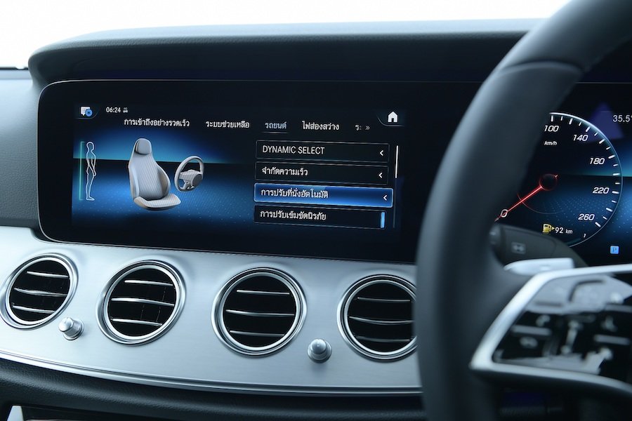 Mercedes-Benz the New E-Class พร้อมผสานทุกการควบคุมเข้าด้วยกันผ่านระบบ MBUX รุ่นล่าสุดที่แสดงผลผ่านหน้าจอแบบ Digital Widescreen cockpit ขนาด 12.3 นิ้วจำนวน 2 หน้าจอรวมถึงฟังก์ชันการทำงานต่าง ๆ ที่ติดตั้งเป็นอุปกรณ์มาตรฐานสำหรับรถยนต์ E-Class ทุกรุ่น ไม่ว่าจะเป็นการควบคุมด้วยระบบสัมผัสหน้าจอ แป้นควบคุมแบบ Touchpad และระบบสั่งการด้วยเสียงรูปแบบใหม่ที่สามารถเริ่มต้นการใช้งานได้ง่ายเพียงพูดว่า “Hey Mercedes” เรื่อยไปจนถึงการผสานรถยนต์และสมาร์ทโฟนเข้าด้วยกันอย่างกลมกลืนด้วยระบบเชื่อมต่อ Smartphone integration ที่ใช้งานได้ทั้ง Apple CarPlay® และ Android Auto และระบบแผนที่นำทางแบบ 3 มิติ ฯลฯ การเชื่อมต่อกับโลกออนไลน์ยังทำได้อย่างไม่มีขีดจำกัดด้วยระบบสัญญาณ 4G-LTE แบบ E-SIM สามารถค้นหาข้อมูลต่าง ๆ เช่น เส้นทาง จุดหมายสำคัญ รายงานสภาพจราจรแบบ Live traffic ฟังวิทยุแบบ Online Radio รวมถึงสามารถติดต่อสื่อสารกับศูนย์บริการได้โดยตรงทั้งการสั่งงานผ่านหน้าจอรถยนต์ หรือผ่านแอปพลิเคชัน Mercedes me