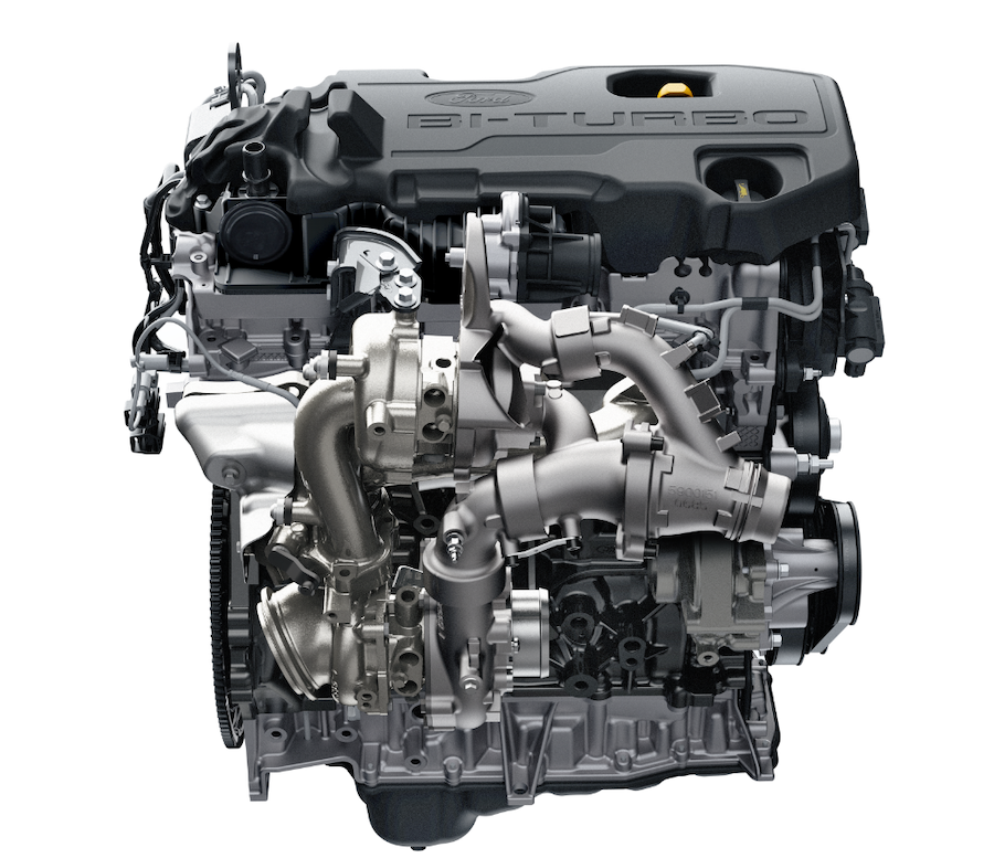 เครื่องยนต์เทอร์โบคู่ของฟอร์ดประกอบด้วยเทอร์โบชาร์จเจอร์ 2 ตัว ตัวเล็กหนึ่งและตัวใหญ่หนึ่ง เมื่อขับที่รอบเครื่องต่ำ เทอร์โบทั้งสองจะทำงานแบบต่อเนื่องและสอดประสานกัน เพื่อเพิ่มแรงบิดและการตอบสนองของเครื่องยนต์อย่างมีประสิทธิภาพ เมื่อความเร็วรอบเครื่องยนต์สูงขึ้น เทอร์โบแรงดันต่ำที่มีขนาดใหญ่กว่าจะเข้ามาทำงานแทนเทอร์โบแรงดันสูงทั้งหมด ทำให้รถมีพละกำลังมากขึ้น