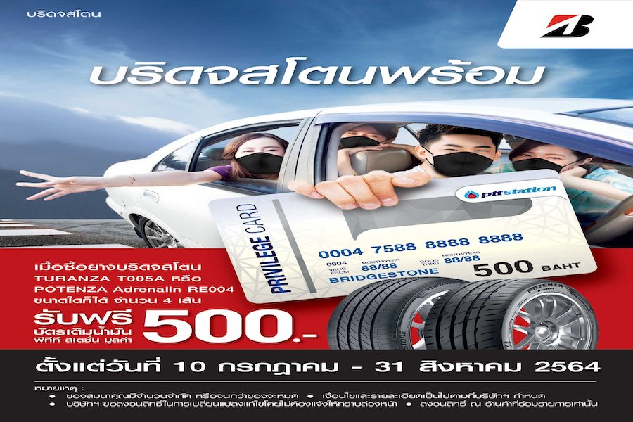 บริษัท บริดจสโตนเซลส์ (ประเทศไทย) จำกัด เดินหน้าจัดโปรโมชั่นสุดพิเศษให้ลูกค้า ไม่ว่าจะเดินทางไปเส้นทางไหน ก็ถึงจุดหมายได้อย่างมั่นใจ เพียงซื้อยางบริดจสโตน TURANZA T005A หรือ POTENZA Adrenalin RE004 ทุกขนาด ครบ 4 เส้น ที่ศูนย์บริการรถยนต์ค็อกพิท ศูนย์บริการแอค หรือร้านค้าตัวแทนจำหน่ายยางบริดจสโตนที่ร่วมรายการ รับฟรี บัตรเติมน้ำมันปตท. มูลค่า 500 บาท โปรโมชั่นนี้ตั้งแต่วันที่ 10 กรกฎาคม - 31 สิงหาคม 2564 (เงื่อนไขและรายละเอียดเป็นไปตามที่บริษัทฯ กำหนด)