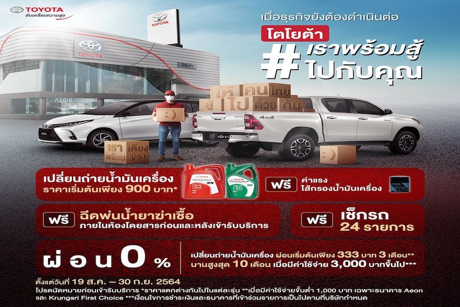 บริษัท โตโยต้า มอเตอร์ ประเทศไทย จำกัด ห่วงใยสุขอนามัย และความปลอดภัยของลูกค้า จากการแพร่ระบาดของเชื้อไวรัสโควิด-19 รอบใหม่ ซึ่งส่งผลกระทบต่อการดำเนินชีวิตของประชาชน และการดำเนินธุรกิจต่างๆ รวมทั้งต้องการมีส่วนช่วยแบ่งเบาภาระของลูกค้าที่ยังมีความจำเป็นต้องใช้รถในชีวิตประจำวัน โดยเฉพาะอย่างยิ่งกลุ่มรถยนต์ขนส่ง หรือธุรกิจโลจิสติกส์ จึงได้จัดบริการทำความสะอาดฆ่าเชื้อแบคทีเรีย และไวรัส โควิด-19 ภายในรถยนต์ พร้อมบริการตรวจเช็กสภาพรถทั่วไปฟรี พิเศษ! ด้วยแคมเปญชุดเปลี่ยนถ่ายน้ำมันเครื่องราคาสุดพิเศษ ณ ศูนย์บริการมาตรฐานของผู้แทนจำหน่ายโตโยต้า 465 แห่งทั่วประเทศ ตั้งแต่วันที่ 19 สิงหาคม – 30 กันยายน 2564