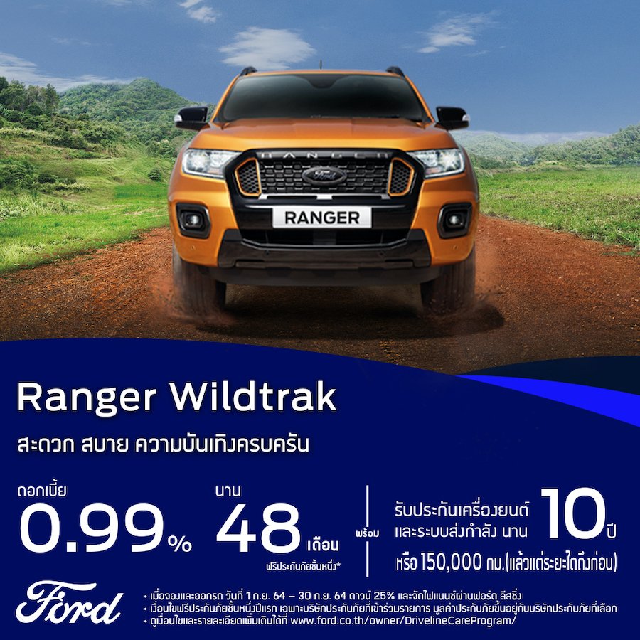 ข้อเสนอราคาพิเศษ ฟอร์ด เรนเจอร์ ดับเบิลแค็บ XLT เกียร์ธรรมดา: ราคาพิเศษ 759,000 บาท จากราคาปกติ 857,000 บาท ฟอร์ด เรนเจอร์ โอเพ่นแค็บ XL+ สปอร์ต ราคาพิเศษ 599,000 บาท จากราคาปกติ 692,000 บาท ข้อเสนอดอกเบี้ยและแคมเปญผ่อนพิเศษ ฟอร์ด เรนเจอร์ ไวลด์แทรค และฟอร์ด เรนเจอร์ FX4 Max: อัตราดอกเบี้ย 0.99% ผ่อนนาน 48 เดือน พร้อมฟรีประกันภัยชั้นหนึ่ง และโปรแกรมรับประกันเครื่องยนต์และระบบส่งกำลังนาน 10 ปี/150,000 กม ฟอร์ด เอเวอเรสต์ ไทเทเนียม พลัส 4x2: อัตราดอกเบี้ย 0% ดาวน์ 30% ผ่อน 48 เดือน พร้อมฟรีประกันภัยชั้นหนึ่ง และโปรแกรมรับประกันเครื่องยนต์และระบบส่งกำลังนาน 10 ปี/150,000 กม. ฟอร์ด เอเวอเรสต์ ไทเทเนียม พลัส 4x4: อัตราดอกเบี้ย 0.99% ดาวน์ 30% ผ่อน 36 เดือน พร้อมฟรีประกันภัยชั้นหนึ่ง และโปรแกรมรับประกันเครื่องยนต์และระบบส่งกำลังนาน 10 ปี/150,000 กม. ฟอร์ด เอเวอเรสต์ สปอร์ต: ผ่อนเริ่มต้น 9,900 บาท พร้อมฟรีประกันภัยชั้นหนึ่ง และโปรแกรมรับประกันเครื่องยนต์และระบบส่งกำลังนาน 10 ปี/150,000 กม.