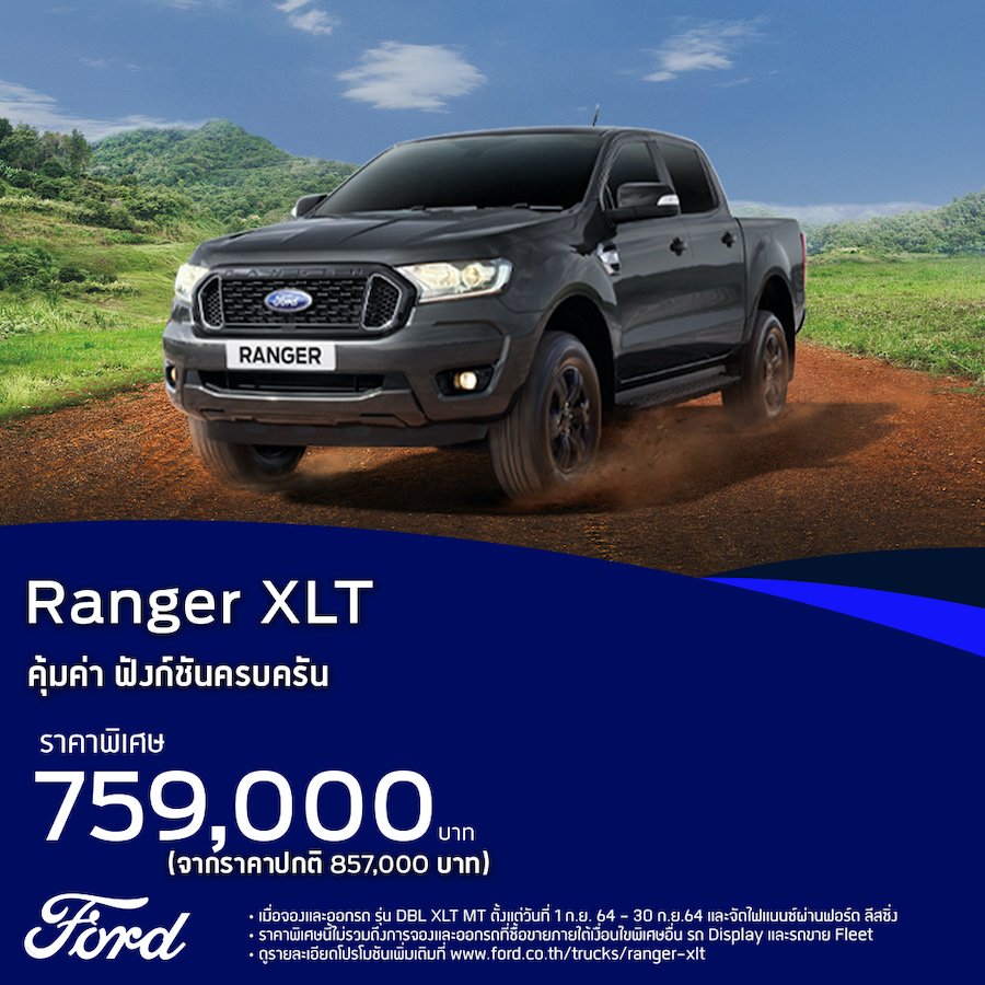 ฟอร์ด ประเทศไทย จัดแคมเปญข้อเสนอสุดพิเศษรับเดือนกันยายน ชูฟอร์ด เรนเจอร์ ดับเบิ้ลแค็บ XLT กระบะ 4 ประตูยกสูง ราคาสุดพิเศษเพียง 759,000 บาท ซึ่งคุ้มค่ากว่าที่เคยมีมาของฟอร์ด พร้อมโปรโมชั่นอื่นๆ อีกมากมาย ตั้งแต่ 1 กันยายน ถึง 30 กันยายน 2564 นอกจากนี้ ฟอร์ดยังร่วมกับผู้จำหน่ายจัดกิจกรรมไลฟ์สด นัดหมายชมรถฟอร์ดที่บ้านคุณ (Showroom On Demand) เพื่อเข้าถึงลูกค้าผ่านช่องทางออนไลน์ ผ่านเฟซบุ๊กและยูทูป ฟอร์ด ในวันที่ 11-12 และ 18-19 กันยายน 2564 โดยลูกค้าที่ร่วมสนุกกับกิจกรรมตามเงื่อนไขและแชร์ไลฟ์จะได้รับสิทธิ์ลุ้นคูปองส่วนลดลาซาด้ามูลค่า 200 บาท จำนวน 600 รางวัล