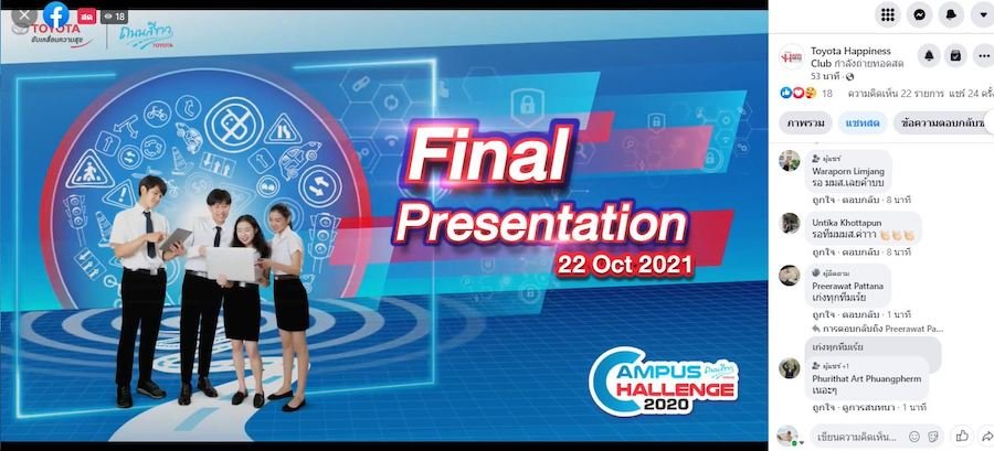 กิจกรรม Campus Challenge 2020 มีนิสิตและนักศึกษาสนใจส่งผลงานเข้าร่วมประกวดทั้งสิ้นกว่า 700 ทีม ซึ่งหลังจากที่ได้นำเสนอแผนในการรณรงค์ขับขี่ปลอดภัยทางท้องถนนในสถานศึกษาแก่คณะกรรมการเป็นที่เรียบร้อยแล้ว จึงได้ทำการคัดเลือก 10 ทีมสุดท้าย ไปเมื่อวันที่ 17 สิงหาคม ที่ผ่านมา ซึ่งแต่ละทีมได้รับทุนสนับสนุนมูลค่า 21,050 บาท ไปใช้ในการจัดทำโครงการประชาสัมพันธ์ความปลอดภัยทางถนนในสถานศึกษาผ่านช่องทางออนไลน์ และจัดทำวีดีโอรณรงค์ขับขี่ปลอดภัย เป็นระยะเวลา 2 เดือน (18 สิงหาคม - 18 ตุลาคม 2564) และในรอบชิงชนะเลิศ ทั้ง 10 ทีมได้นำเสนอผลงานต่อคณะกรรมการ ผ่านช่องทางการประชุมออนไลน์ (Zoom Meeting) เพื่อคัดเลือกผู้ชนะเลิศ โดยได้รับเกียรติจากคณะกรรมการผู้เชี่ยวชาญในด้าน