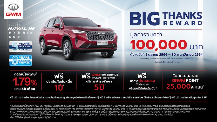 เพื่อเป็นการขอบคุณและตอบแทนลูกค้าที่ให้การสนับสนุน All New HAVAL H6 Hybrid SUV เป็นอย่างดีมาอย่างต่อเนื่อง เกรท วอลล์ มอเตอร์ พร้อมมอบแคมเปญสุดพิเศษ BIG THANKS REWARD เพื่อมอบคะแนน GWM Point พิเศษอีก 10,000 คะแนน ให้กับลูกค้าทุกคน ทั้งลูกค้าเดิมที่ซื้อและรับรถยนต์ All New HAVAL H6 Hybrid SUV ไปแล้วตั้งแต่วันที่ 1 กรกฏาคม ที่ผ่านมา และลูกค้าใหม่ที่มีแผนจะซื้อและรับรถยนต์ตั้งแต่วันที่ 22 ตุลาคม ถึงวันที่ 30 พฤศจิกายน นี้ โดยจะได้รับคะแนน GWM Point เพิ่มอีก 10,000 คะแนน จากเดิม 15,000 คะแนน รวมเป็น 25,000 คะแนน