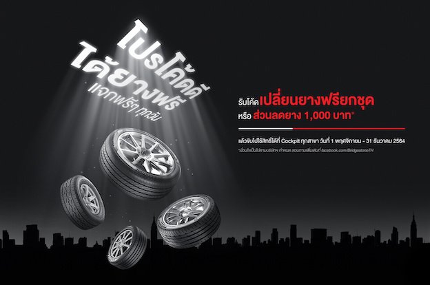 บริดจสโตน และค็อกพิท จัดโปรโมชั่นสุดพิเศษส่งท้ายปี ในแคมเปญ “โปรโค้ดดี ได้ยางฟรี” ทุกวัน จัดเต็มแทนคำขอบคุณเพื่อลูกค้าบริดจสโตน และค็อกพิทโดยเฉพาะ เพียงลงทะเบียนผ่านเว็ปไซต์ https://bridgestonespecialcampaign.cockpit.co.th หรือแอดไลน์ @BridgestoneTH หรือ @Cockpit โดยสามารถเก็บโค้ดตั้งแต่วันที่ 1 พฤศจิกายน – 25 ธันวาคม 2564 รับยางฟรียางบริดจสโตนยกชุด หรือรับส่วนลดยาง 1,000 บาท* แจกหนักแจกจริงทุกวัน