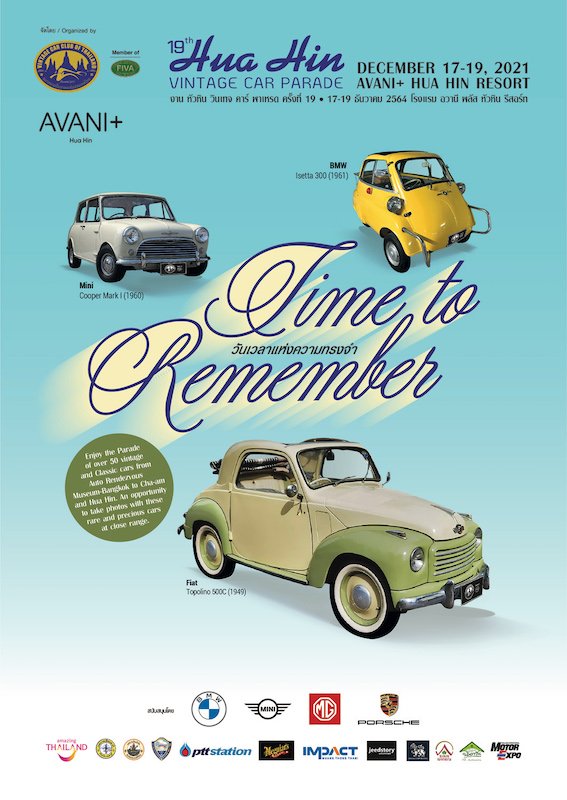 สมาคมรถโบราณแห่งประเทศไทย โรงแรมอวานี พลัส หัวหิน รีสอร์ท หอการค้าจังหวัดเพชรบุรี เทศบาลเมืองชะอำ เทศบาลเมืองหัวหิน และ ททท. ร่วมกันจัดงาน “หัวหิน วินเทจคาร์ พาเหรด ครั้งที่ 19” ตามแนวคิด “วันเวลาแห่งความทรงจำ” วันที่ 17 – 19 ธันวาคม นี้