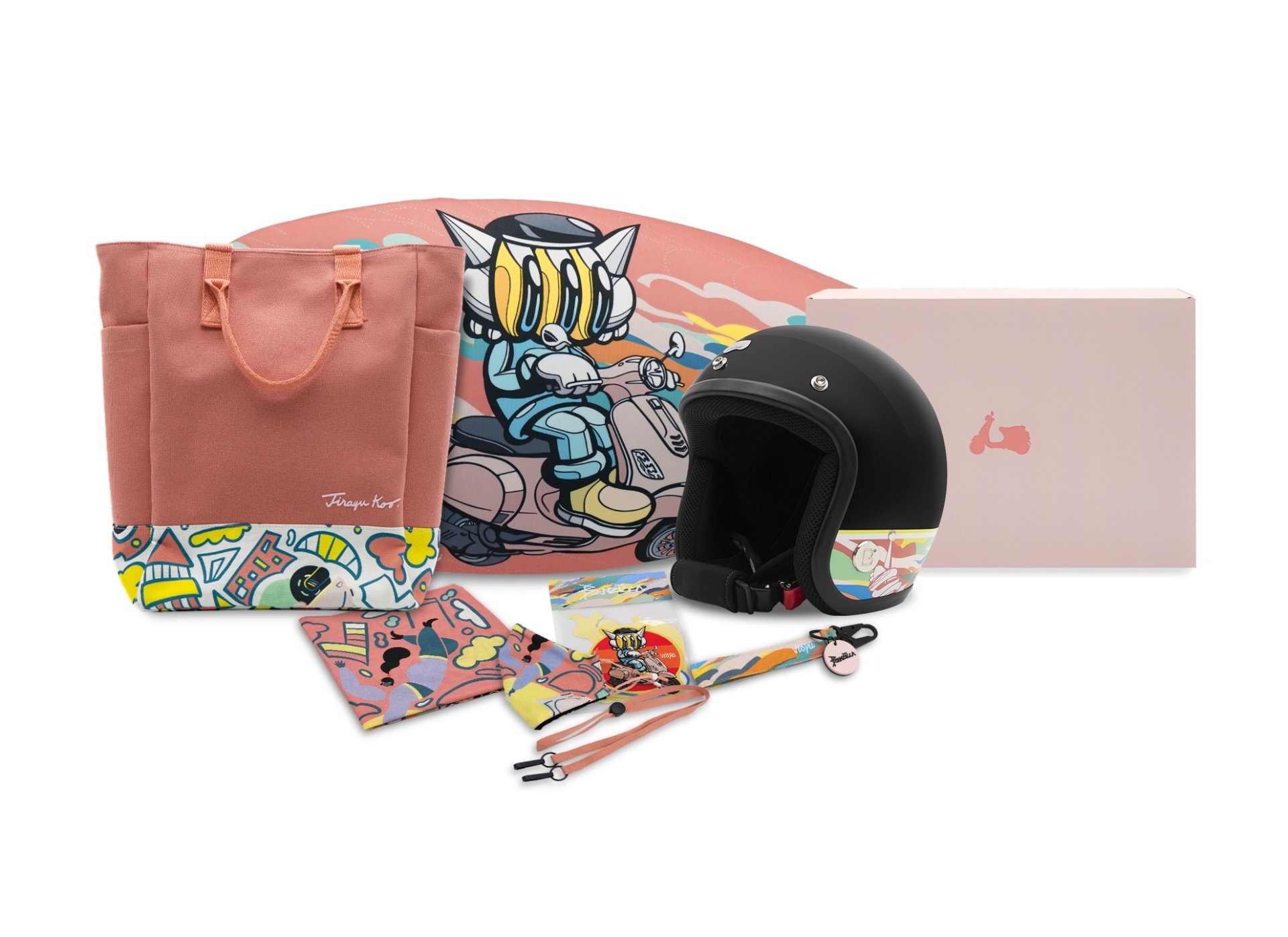 LIVE LIFE OUT OF THE ORDINARY….เติมเฉดใหม่ให้ชีวิตมีสีสันไม่ซ้ำใคร คอนเซ็ปต์ที่บ่งบอกตัวตนของ Vespa LX 125 i-Get กับเฉดสีใหม่ล่าสุด สีชมพู “PINK ROSA” เป็นอีกครั้งที่เวสป้าได้หยิบยกสีสันความสดใสมาอยู่บนสกู๊ตเตอร์ พร้อมเพิ่มความพิเศษมากขึ้น กับการ Collabs กับ 2 ศิลปินไทยชื่อดังอย่าง Benzilla ศิลปินสตรีทอาร์ต ที่เราคุ้นตาจากผลงานสุดโดดเด่น ‘LOOOK’ และอีกหนึ่งศิลปินอิลลัสเตรเตอร์ Jirayu Koo จากผลงานตัวการ์ตูนสุดน่ารัก ‘น้องกลมกลม’ กับคาแรกเตอร์ลักษณะอ้วนกลม เต็มไปด้วยความสดใสและสีสันที่หลากหลาย ซึ่งทั้งสองเคยได้ฝากผลงานร่วมผลกับบรรดาแบรนด์ดัง ๆ มาแล้วมากมาย มาร่วมออกแบบพรีเมี่ยมคอลเลคชั่นให้กับสกู๊ตเตอร์ Vespa LX 125 i-Get (PINK ROSA) ที่ประกอบไปด้วย หมวกกันน็อก ผ้าคลุมเบาะ พวงกุญแจ กระเป๋าผ้าพันคอ หน้ากากผ้า และ ชุดสติกเกอร์ เรียกว่าเป็น Perfect Combination เมื่อจับคู่เข้ากันกับตัวสกู๊ตเตอร์