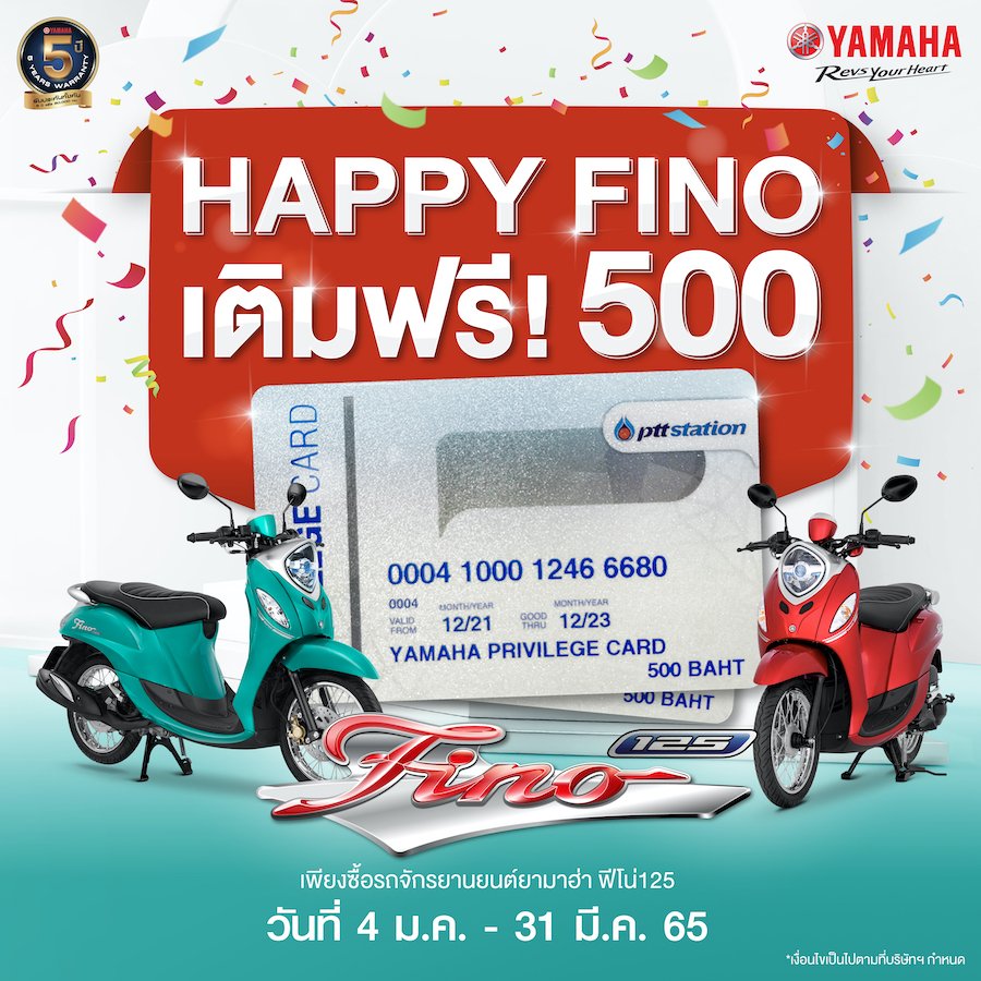 บริษัท ไทยยามาฮ่ามอเตอร์ จำกัด ผู้นำรถจักรยานยนต์ระบบออโตเมติกชั้นนำของโลก กระตุ้นตลาดเอาใจลูกค้าด้วยการจัดโปรโมชั่นเด็ด “HAPPY FINO เติมฟรี! 500” เมื่อซื้อรถจักรยานยนต์ยามาฮ่า ฟีโน่ ขนาดเครื่องยนต์ 125 ซีซี ที่ร้านผู้จำหน่ายรถจักรยานยนต์ยามาฮ่าที่ร่วมรายการ ระหว่างวันที่ 4 มกราคม – 31 มีนาคม 2565 รับฟรี! บัตรเติมน้ำมัน มูลค่า 500 บาท พร้อมเพิ่มความมั่นใจคุณภาพสินค้าด้วยการรับประกัน 5 ปี หรือ 50,000 กิโลเมตร