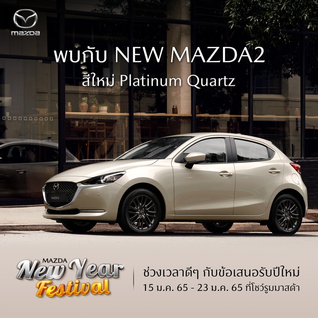 มาสด้าได้จัดแคมเปญพิเศษ Mazda New Year Festival ช่วงเวลาดีๆ กับข้อเสนอรับปีใหม่ ระหว่างวันที่ 15 – 23 มกราคม 2565 ที่โชว์รูมมาสด้า พบกับ NEW MAZDA2 สีใหม่ แพลตทินั่ม ควอตซ์ พร้อมด้วยข้อเสนอมากมายให้ลูกค้าที่ต้องการออกรถใหม่ทุกรุ่น กับดอกเบี้ยต่ำสุด 0%*, ฟรีประกันภัยชั้น 1* Mazda Premium Insurance และลูกค้า 800 ท่านแรกที่จองรถภายในงาน 3,000 บาท และออกรถภายในวันที่ 31 มกราคม 2565 รับฟรี Sony Portable Wireless Speaker มูลค่า 1,990 บาท** นอกจากนี้ มาสด้ายังได้มอบข้อเสนอด้านบริการหลังการขาย ภายใต้แคมเปญ Mazda Festival ช่วงเวลาดีๆ กับข้อเสนอเพื่อดูแลรถคุณ ระหว่างวันที่ 1 – 31 มกราคม 2565 ที่ศูนย์บริการมาสด้า กับข้อเสนอ ผ่อนชำระ 0%* นานสูงสุด 10 เดือน, รับเครดิตเงินคืนสูงสุด 8,000 บาท* และแลกคะแนนสะสม รับส่วนลดสูงสุด 13%* พร้อมนำมารับสิทธิ์ลดหย่อนภาษีได้สูงสุด 30,000 บาท มาตรการ “ช้อปดี…มีคืน”