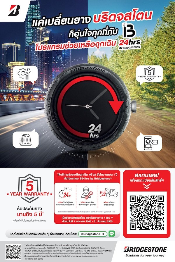 บริดจสโตน จัดโปรโมชั่นพิเศษ “B-24 hrs. บริการช่วยเหลือฉุกเฉิน 24 ชั่วโมง ฟรี 1 ปี” สำหรับลูกค้าที่ซื้อยางบริดจสโตนรุ่นที่ร่วมรายการ จำนวน 4 เส้น และลงทะเบียนรับประกันยาง* ผ่านไลน์ @bridgestoneTH หรือ ผ่านเว็บไซต์ https://www.bridgestone.co.th/th/customer-care/tire-registration ตั้งแต่วันนี้ ถึง 31 ธันวาคม 2565