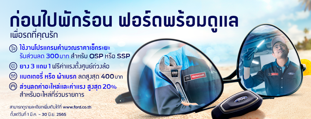ฟอร์ด ประเทศไทย เดินหน้ามอบความมั่นใจในการใช้รถให้กับลูกค้าตลอดช่วงเทศกาลวันหยุด ล่าสุดเปิดตัวแคมเปญ ‘ก่อนไปพักร้อน ฟอร์ดขอดูแล’ คัดสรรข้อเสนอด้านบริการแบบครบครัน อาทิ ส่วนลดพิเศษชุดน้ำมันเครื่องสุดคุ้ม (Oil Save Pack) ส่วนลดโปรแกรมบำรุงรักษาตามระยะเมื่อแสดงเอกสารจากโปรแกรมประเมินค่าใช้จ่ายในการเข้ารับบริการ (Service Price Calculator) มูลค่า 300 บาท ส่วนลดค่าอะไหล่สูงสุดถึง 20% ข้อเสนอพิเศษ ซื้อยางรถยนต์ 3 เส้น แถมฟรี 1 เส้น และส่วนลดพิเศษสำหรับการเปลี่ยนผ้าเบรก หรือแบตเตอรี่ บริการตรวจเช็คสภาพรถทั่วไปฟรี 30 รายการ รวมถึงบริการรับและส่งมอบรถนอกสถานที่และหน่วยบริการเคลื่อนที่ Mobile Service เพียงนำรถเข้ารับบริการที่ศูนย์บริการฟอร์ดทั่วประเทศตั้งแต่วันที่ 1 มีนาคม – 30 มิถุนายน 2565