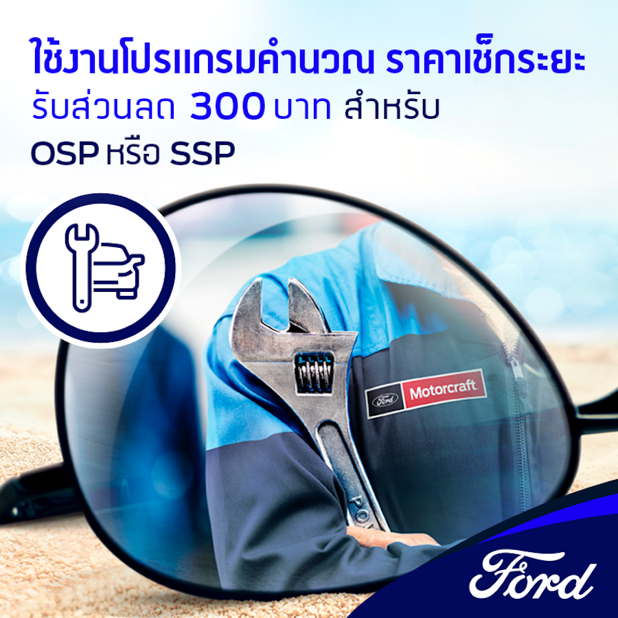ฟอร์ดเน้นย้ำความมั่นใจในการส่งมอบการบริการและใส่ใจทุกการเดินทางของลูกค้าจึงได้อำนวยความสะดวกให้ลูกค้าสามารถประเมินค่าใช้จ่ายในการเข้ารับบริการบำรุงรักษาตามระยะในแต่ละครั้งล่วงหน้าได้ทางเว็บไซต์: https://www.ford.co.th/owner/service-price-calculator/ เพื่อให้ลูกค้าไม่ต้องกังวลกับค่าใช้จ่ายในการเข้ารับบริการแต่ละครั้ง โดยตลอดช่วงระยะเวลาแคมเปญนี้ลูกค้าที่แสดงเอกสารจากโปรแกรมประเมินค่าใช้จ่ายในการเข้ารับบริการจะได้รับส่วนลดพิเศษมูลค่า 300 บาท สำหรับโปรแกรมบำรุงรักษารถยนต์ (SSP) หรือ โปรแกรมน้ำมันเครื่องสุดคุ้ม (OSP) ซึ่งส่วนลดพิเศษนี้ จะมอบให้กับลูกค้ารถฟอร์ดทุกรุ่น โดยไม่จำกัดระยะทาง