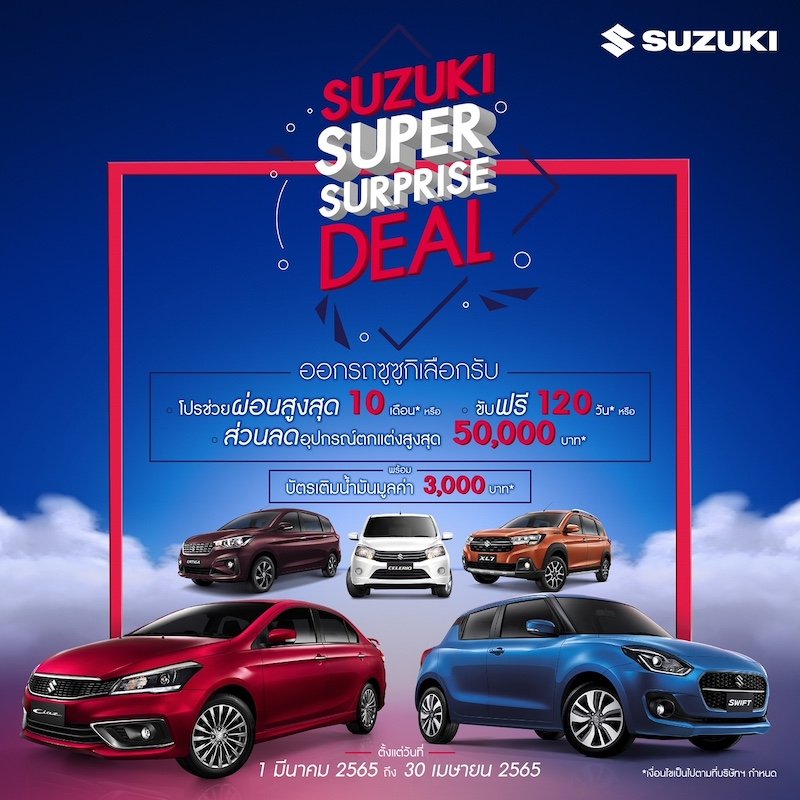 แคมเปญ “SUZUKI SUPER SURPRISE DEAL” มอบให้ลูกค้าที่จองและรับรถยนต์ซูซูกิทุกท่าน โดยสามารถเลือกรับข้อเสนอพิเศษ รถยนต์ซูซูกิรุ่น SWIFT ขับฟรี 120 วัน หรือโปรแกรมช่วยผ่อนค่างวดรถ 10 เดือน เดือนละ 4,000 บาท เฉพาะสถาบันการเงินที่ร่วมโครงการ พร้อมรับบัตรเติมน้ำมัน มูลค่า 3,000 บาท สำหรับรถยนต์ซูซูกิรุ่น SWIFT, และ CIAZ ส่วนลดอุปกรณ์ตกแต่งมูลค่าสูงสุด 50,000 บาท (เฉพาะรุ่นที่กำหนด) ดอกเบี้ยพิเศษ 0% นานถึง 48 เดือน (เฉพาะรุ่นที่กำหนด) อีโคคาร์ผ่อนเริ่มต้นเพียงเดือนละ 1,999 บาท (สำหรับรถยนต์ซูซูกิรุ่น CELERIO GA M/T) ฟรี ประกันภัยชั้น 1 ปีแรก ฟรี บริการช่วยเหลือฉุกเฉิน 24 ชั่วโมง ระยะเวลา 3 ปี (สำหรับรถยนต์ซูซูกิรุ่น SWIFT, CIAZ, CELERIO, XL7 และ ERTIGA) ซึ่งสิทธิพิเศษดังกล่าว จะมอบให้เฉพาะลูกค้าที่จองและรับรถตั้งแต่วันที่ 1 มีนาคม – 30 เมษายน 2565 โดยข้อกำหนดและเงื่อนไขต่างๆ ต้องเป็นไปตามที่บริษัทฯ กำหนด โดยผู้ที่สนใจสามารถติดต่อสอบถามรายละเอียดได้ที่โชว์รูมรถยนต์ซูซูกิทั่วประเทศ เพื่อเป็นการตอกย้ำในความสำเร็จในครั้งนี้และผลักดันยอดขายของรถยนต์ซูซูกิในช่วงฤดูการขายต้นปี รวมถึงการเข้าร่วมงานบางกอก อินเตอร์เนชั่นแนล มอเตอร์โชว์ ครั้งที่ 43 ที่จะมีขึ้นในวันที่ วันที่ 23 มีนาคม - 3 เมษายน 2565 ณ อาคาร IMPACT Challenger 1-3 เมืองทองธานี    อีกทั้ง ซูซูกิมั่นใจว่าจะสามารถมีส่วนช่วยกระตุ้นยอดขายรถยนต์ซูซูกิทุกรุ่นได้ตามเป้าหมาย 30,000 คันในปี 2565 โดยแบ่งเป็นรุ่นดังนี้ SUZUKI SWIFT เป้าหมายจำหน่ายอยู่ที่ 12,000 คัน SUZUKI CIAZ เป้าหมายจำหน่ายอยู่ที่ 3,600 คัน SUZUKI CELERIO เป้าหมายจำหน่ายอยู่ที่ 3,100 คัน SUZUKI XL7 เป้าหมายจำหน่ายอยู่ที่ 5,400 คัน SUZUKI ERTIGA  เป้าหมายจำหน่ายอยู่ที่ 1,700  คัน SUZUKI CARRY เป้าหมายจำหน่ายอยู่ที่ 4,200 คัน