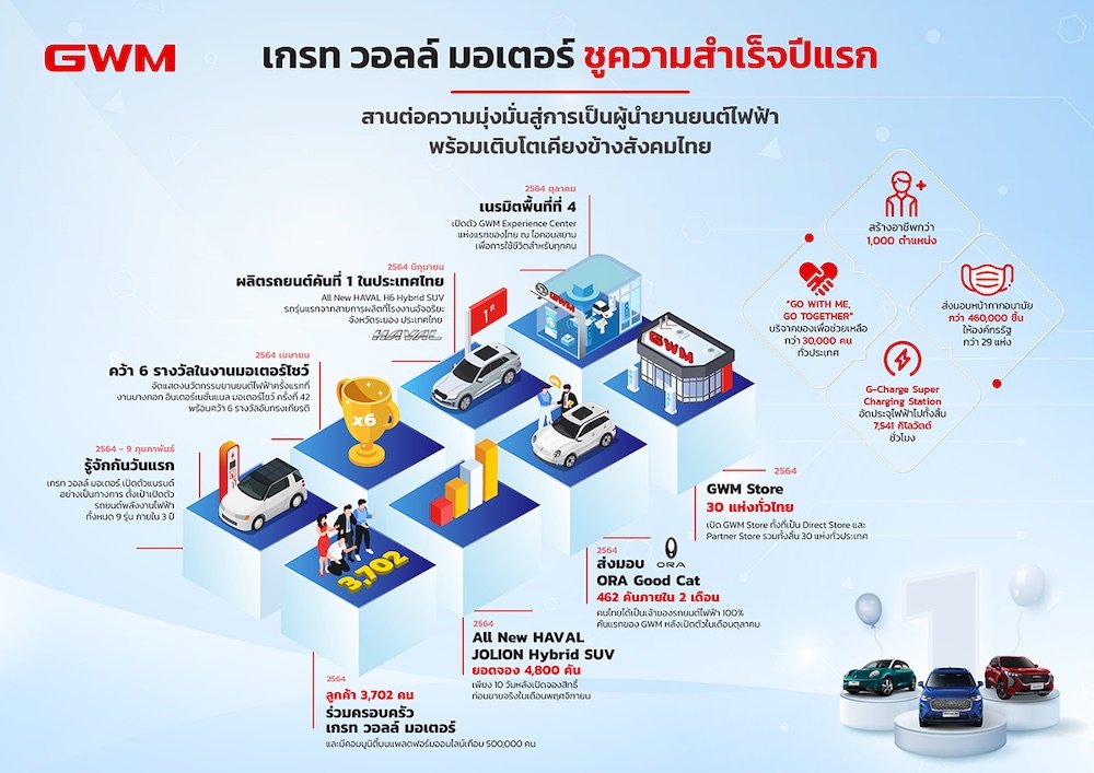 เกรท วอลล์ มอเตอร์ ได้รวบรวมตัวเลขและสรุปเหตุการณ์สำคัญในปี 2564 ที่ไม่เพียงเป็นเครื่องยืนยันความสำเร็จของการดำเนินธุรกิจในประเทศไทย เพื่อก้าวขึ้นสู่การเป็นผู้นำด้านรถยนต์พลังงานไฟฟ้าอย่างแข็งแกร่ง แต่ยังเสริมสร้างความใกล้ชิดระหว่างแบรนด์กับผู้บริโภคให้แน่นแฟ้นมากยิ่งขึ้น ดังนี้