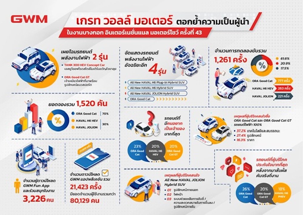 เกรท วอลล์ มอเตอร์ ขอบคุณผู้บริโภคชาวไทยสำหรับกระแสตอบรับอย่างท่วมท้นจากการจัดแสดงทัพรถยนต์ไฟฟ้าสุดล้ำและนวัตกรรมล้ำสมัย ภายใต้แนวคิด “Leading the Future” รวมไปถึงกิจกรรมต่างๆ ที่จัดขึ้นเพื่อให้ผู้เยี่ยมชมได้ทำความรู้จักผลิตภัณฑ์รถยนต์และบริการของ เกรท วอลล์ มอเตอร์ มากขึ้น ในงานบางกอก อินเตอร์เนชั่นแนล มอเตอร์โชว์ ครั้งที่ 43 ซึ่งตลอดระยะเวลา 14 วันของการจัดงาน มีผู้ให้ความสนใจเข้าเยี่ยมชมบูธของ เกรท วอลล์ มอเตอร์ อย่างคับคั่ง โดยมียอดดาวน์โหลด GWM Fun App เพื่อร่วมกิจกรรมภายในบูธถึง 3,226 คน นอกจากนี้ ภายในงานยังมีผู้สนใจทดลองขับรถยนต์ xEV ทั้ง 3 รุ่น (All New HAVAL H6 Hybrid SUV, All New HAVL JOLION Hybrid SVU และ ORA Good Cat) รวมทั้งสิ้น 1,261 ครั้ง พร้อมตอกย้ำความร้อนแรงด้วยการกวาดยอดจองไปได้กว่า 1,520 คันจากผลิตภัณฑ์ที่มีอยู่ในตลาดเพียง 3 รุ่น ในช่วงระยะเวลาเดียวกัน GWM แอปพลิเคชัน ยังดึงดูดผู้ใช้ใหม่เพิ่มขึ้นถึง 21,423 คน ส่งผลให้ในปัจจุบันมีผู้ใช้งานแพลทฟอร์มอัจฉริยะของ เกรท วอลล์ มอเตอร์ ผ่าน GWM แอปพลิเคชันนี้กว่า 80,129 คน สะท้อนความสำเร็จของการส่งมอบประสบการณ์ใหม่ให้กับผู้บริโภคภายใต้การดำเนินกิจการในแบบ Online to Offline ของบริษัทที่ให้บริการเทคโนโลยีอัจฉริยะระดับโลกที่มุ่งก้าวขึ้นเป็นผู้นำด้านยานยนต์พลังงานไฟฟ้าของไทยอย่างแท้จริง