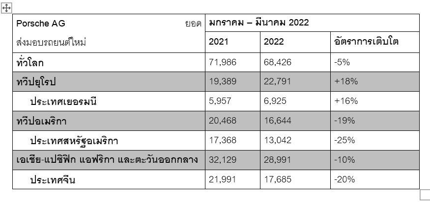 เมื่อพิจารณาถึงภาพรวม รถยนต์ปอร์เช่ ถูกส่งมอบถึงมือลูกค้าในภูมิภาค เอเชีย แปซิฟิก, แอฟริกา และตะวันออกกลาง จำนวน 28,991 คัน ทั้งนี้เมื่อมองเฉพาะภูมิภาคที่อยู่ภายใต้การดูแลของ Porsche Asia Pacific¹ ถือว่ายังคงรักษาระดับผลการดำเนินงานได้อย่างแข็งแกร่ง โดยในไตรมาสแรกของปี 2022 มีอัตราการเติบโตของยอดจำหน่ายที่เพิ่มขึ้นอย่างสวยงามเมื่อเปรียบเทียบกับช่วงเวลาเดียวกันกับปีก่อนหน้าได้ถึง 23 เปอร์เซ็นต์ ถึงแม้ว่าในไตรมาสแรกของปี 2021 จะยังคงครองผลงานในการทำลายสถิติได้สูงสุดตลอดกาลก็ตาม และถือเป็นสถานการณ์เชิงบวกที่ Porsche Asia Pacific สามารถสร้างสถิติผลงานด้านยอดจำหน่ายเอาไว้ได้เป็นอย่างดีในปี 2021 ตลอดทั้งภูมิภาค ในส่วนของประเทศสหรัฐอเมริกา แม้จะต้องเผชิญกับการขาดแคลนวัตถุดิบ และปัญหาการขนส่ง ที่ส่งผลกระทบต่อผู้ผลิตรถยนต์หลายแบรนด์ แต่ยังสามารถส่งมอบรถยนต์ปอร์เช่ให้กับลูกค้าได้จำนวน 13,042 คัน และเมื่อเปรียบเทียบกับไตรมาสแรกของปีที่แล้ว ถือเป็นการทำสถิติยอดจำหน่ายสูงสุด