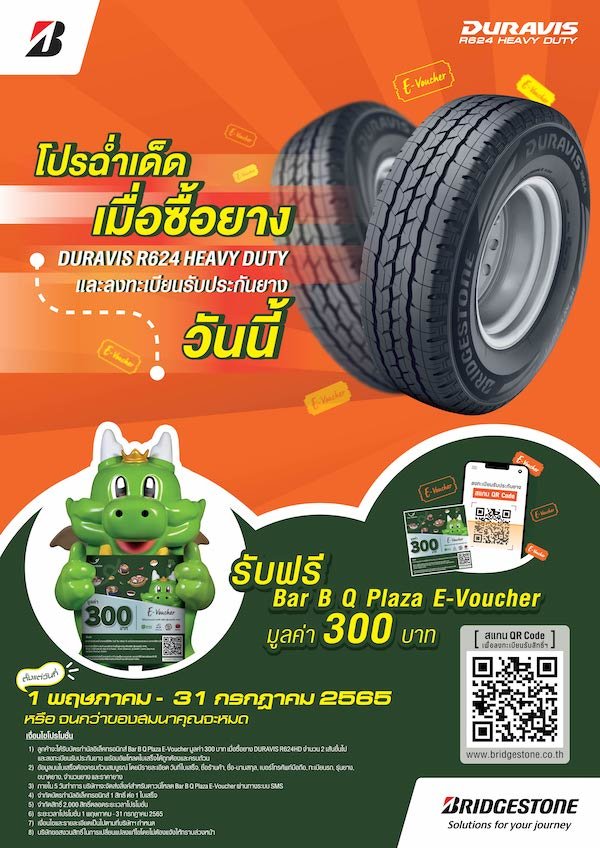 บริษัท บริดจสโตนเซลส์ (ประเทศไทย) จํากัด จัดโปรโมชั่นพิเศษเอาใจสายปิ้งย่าง กับโปรฉ่ำเด็ด เพียงซื้อผลิตภัณฑ์ยาง “DURAVIS R624 HEAVY DUTY” จำนวน 2 เส้นขึ้นไป และลงทะเบียนรับประกันยาง รับฟรี Bar B Q Plaza E-Voucher มูลค่า 300 บาท เพียงลูกค้าลงทะเบียนรับสิทธิ์ โดยสแกน QR Code หรือลงทะเบียนผ่านเว็บไซต์ www.bridgestone.co.th ได้ตั้งแต่วันที่ 1 พฤษภาคม - 31 กรกฎาคม 2565 หรือจนกว่าของสมนาคุณจะหมด