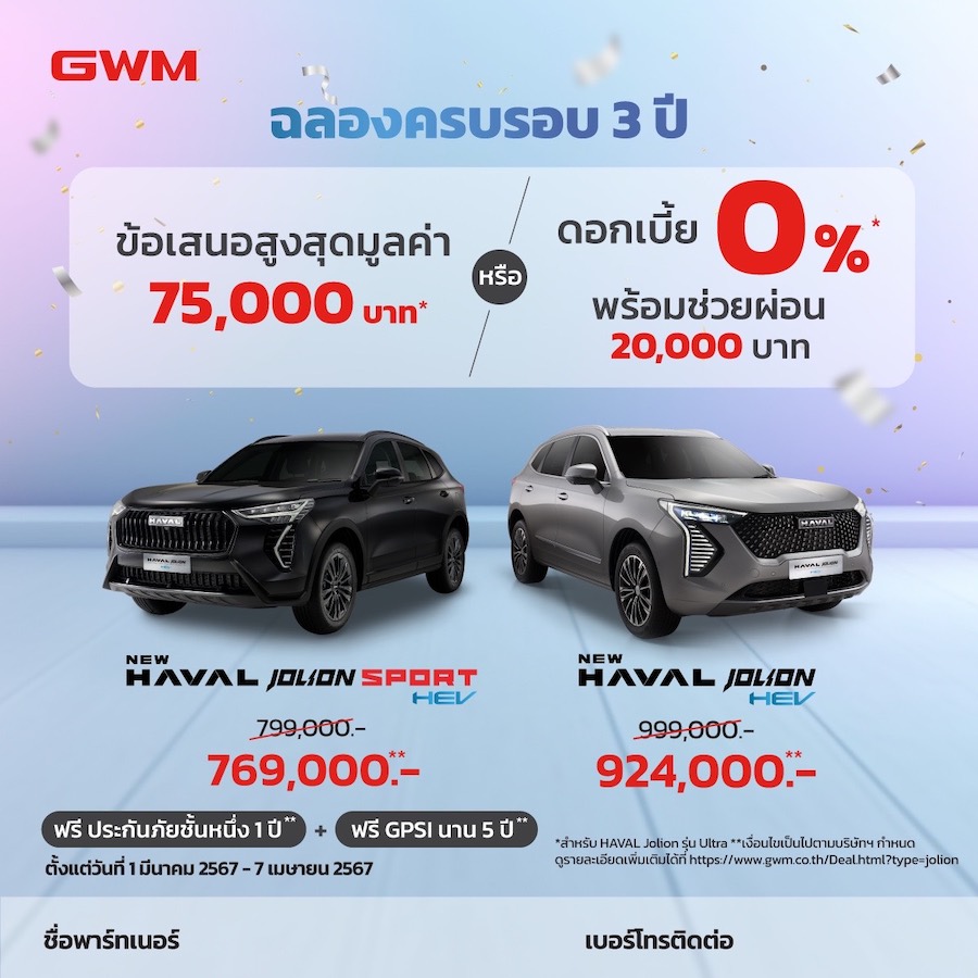 สำหรับแฟน ๆ ของเจ้าสิงโตอารมณ์ดี New GWM HAVAL JOLION Hybrid SUV รุ่น ULTRA รับข้อเสนอสุดพิเศษ มูลค่าสูงสุดกว่า 190,000 บาท สามารถเลือกข้อเสนอทั้งส่วนลดเงินสดมูลค่าสูงสุด 75,000 บาท หรือดอกเบี้ยพิเศษ 0%** ผ่อนนาน 48 เดือน เมื่อดาวน์ 25% มูลค่าสูงสุดไม่เกิน 89,000 บาท พร้อมกับ GWM ช่วยผ่อนนาน 5 เดือน เดือนละ 4,000 รวมมูลค่าสูงสุดไม่เกิน 20,000 บาท**