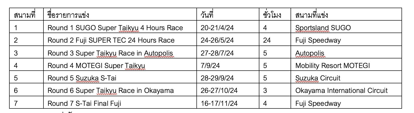 รายการ “ENEOS Super Taikyu Series 2024 Empowered by BRIDGESTONE” หรือ “Super Taikyu Series” เป็นรายการแข่งรถสุดทรหดสำหรับรถยนต์เพื่อการพาณิชย์ทั่วไป ซึ่งเริ่มตั้งแต่ปี 1991 โดยเป็นที่รู้จักกันในชื่อ “S-Tai” ในบรรดาคนญี่ปุ่น และเป็นรายการแข่งขันที่เป็นที่นิยมสูงสุดรายการหนึ่งในช่วงหลายปีที่ผ่านมา ในฐานะที่เป็นรายการแข่งขันรถสุดทรหด ซึ่งเปิดให้คนทั่วไปสามารถเข้าแข่งขันได้ ที่สำคัญคือมีนักแข่งจากประเทศต่างๆ ในเอเชียเข้าร่วมแข่งขันมากขึ้นเรื่อยๆ ในช่วงปีที่ผ่านมา